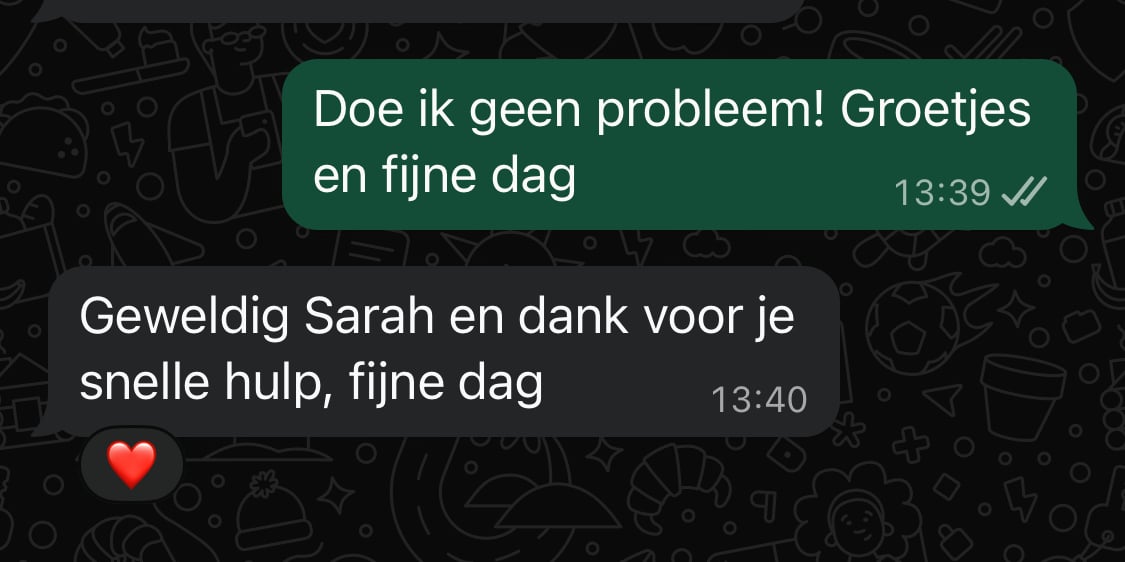 Geen probleem. Mail gerust naar [email protected] of WhatsApp naar